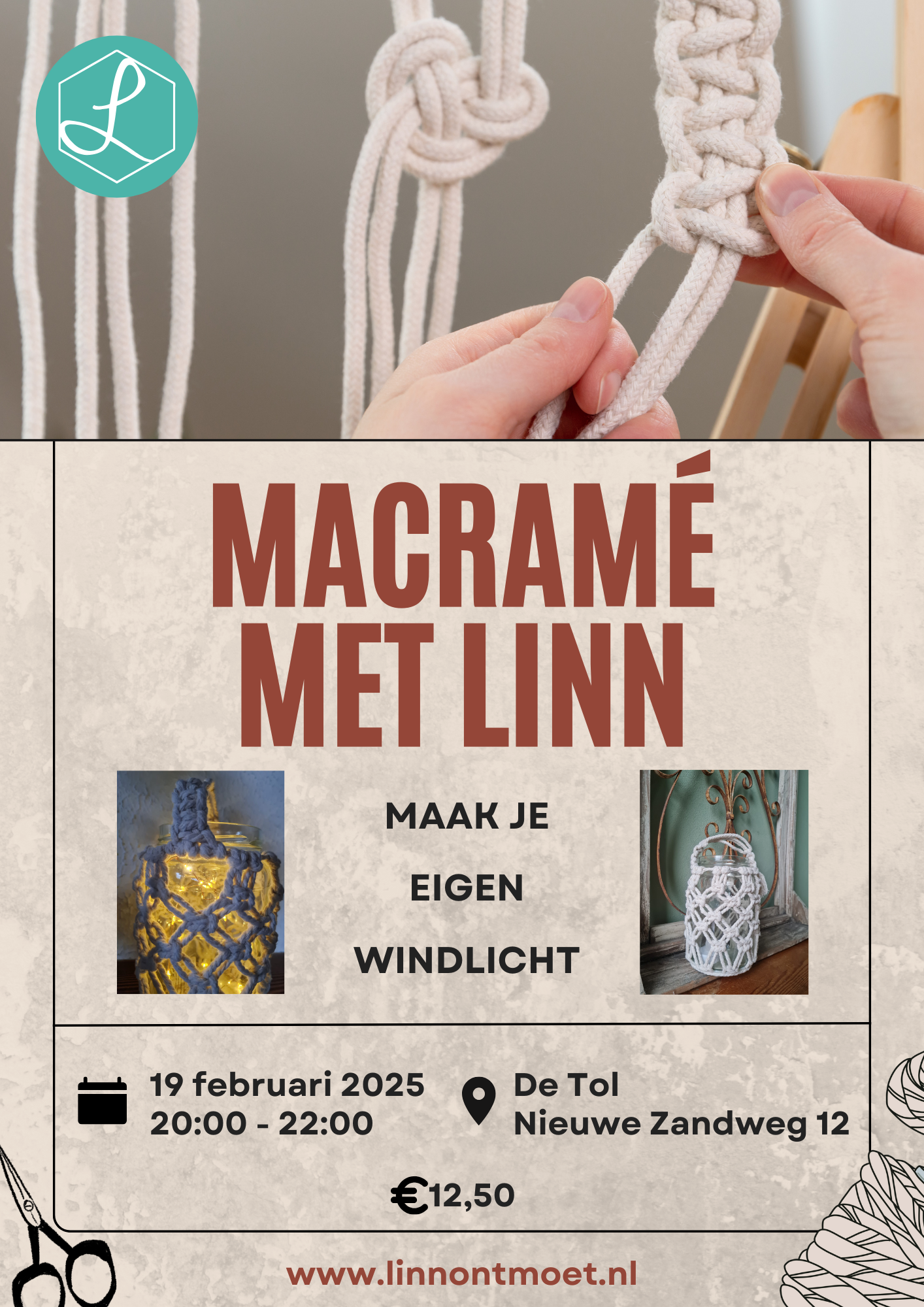 Op woensdagavond 19 februari van 20:00 tot 22:00 in de Tol. Op deze avond krijg je les in de basisprincipes van macramé en ga je snel zelf aan de slag. Aan het eind van de avond ga je met een prachtig windlicht naar huis. Een geweldige manier om sfeer en stijl aan je huis toe te voegen!